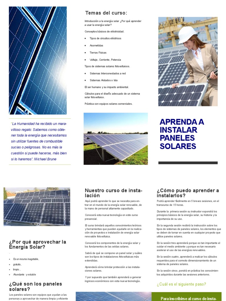 Curso energia solar fotovoltaica pdf. Curso de energia solar fotovoltaica a electricidade que vem do sol i introdução ii composição física e fabricação dos dispositivos fotovoltaicos iii conceitos eléctricos iv curvas características das células fotovoltaicas v configuração de sistemas de produção fotovoltaicos. Un buen curso sobre la energia fv 2019 07 23 isaac. Me gustaría que uds implementaran con vídeos en la cual se este explicando como se hace una instalación de panel solar yo se que es un curso virtual pero tener algo práctico ayuda mucho para generar más. Este curso está orientado a los interesados en aprender sobre los módulos fotovoltaicos y utiliza las herramientas típicas de los cursos mooc massive online open course.